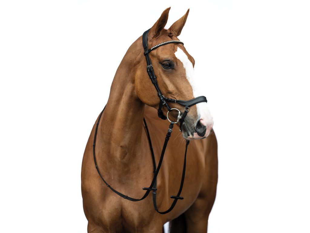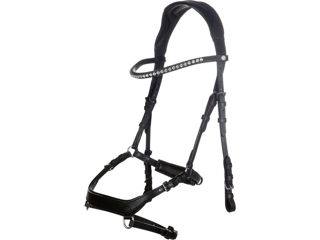 Uzdečka Pro Anatomic je vyrobena z vysoce kvalitní kůže. Anglický nánosník je anatomicky tvarovaný. Nánosník a nátylník jsou měkce polstrované. Široký nátylník s výřezy pro uši zabraňuje tlaku na citlivé oblasti hlavy koně. Čelo je zdobeno syntetickými diamanty. Otěže jsou vyrobeny z tkané tkaniny s koženými zarážkami.